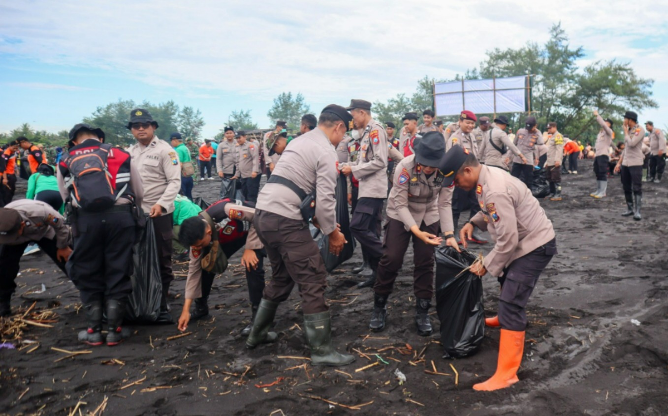Ratusan personel Polres Lumajang Polda Jatim menyisir bibir pantai membersihkan sampah plastik maupun limbah organik yang terbawa arus laut.