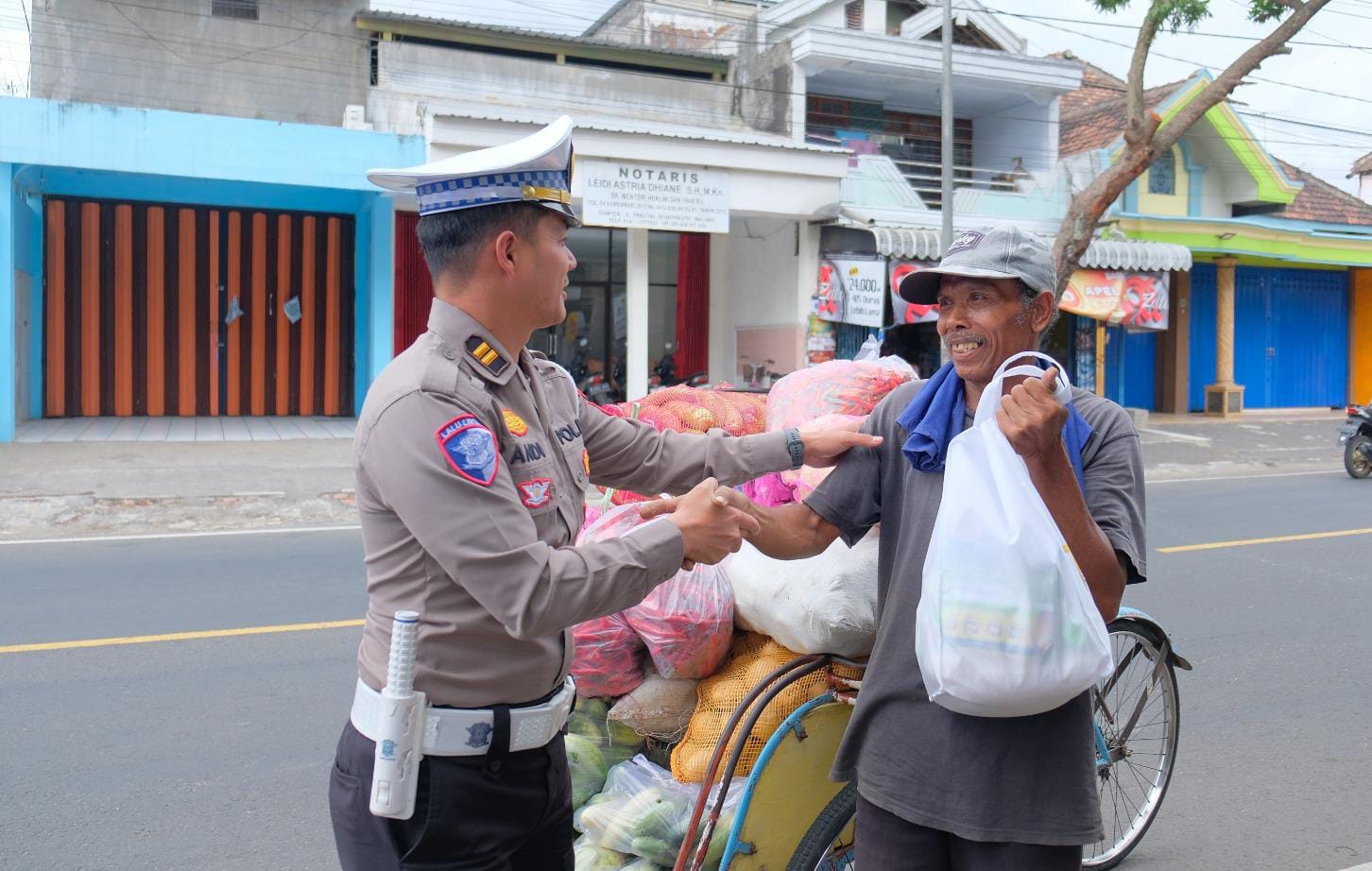 Paket berisi kebutuhan pokok itu langsung dibagikan personel Satlantas ke titik-titik keramaian.